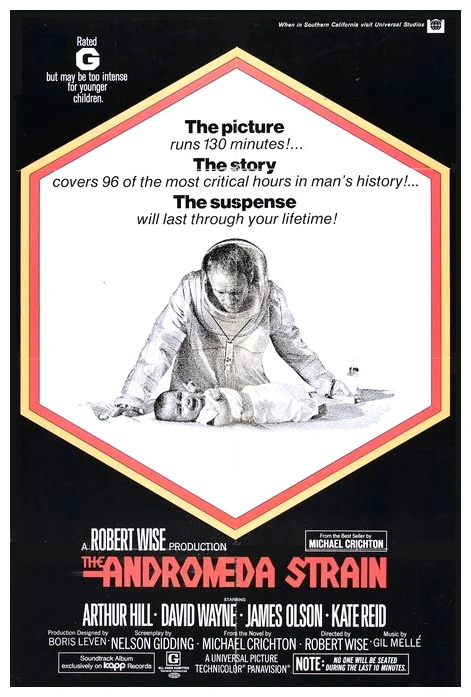 The Andromeda Strain is a 1971 American science fiction thriller film produced and directed by Robert Wise, based on Michael Crichton's 1969 novel of the same name. The films stars Arthur Hill, James Olson, Kate Reid, and David Wayne.